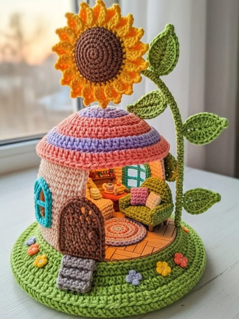 This type of crochet project is also especially appealing because it offers visible progress in stages. You can complete the base house shape, then the roof, then the sunflower, then the tiny decorative details, which keeps the process interesting and motivating from start to finish.