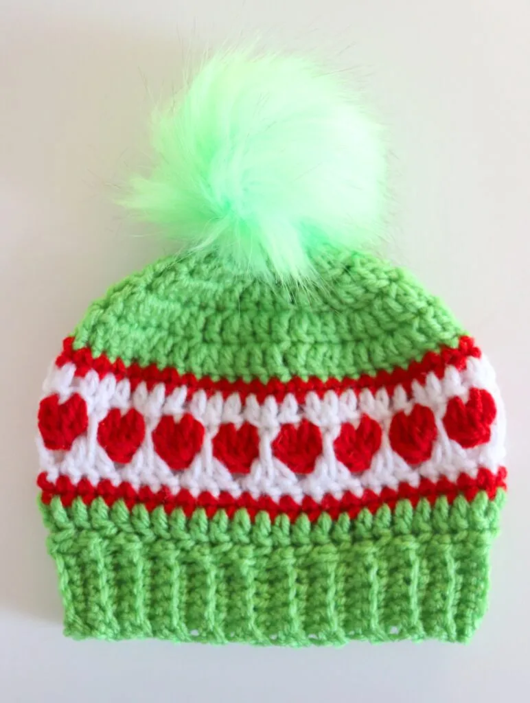 The Grinch-Inspired Hearts in a Row Crochet Hat is a creative and festive crochet project that blends holiday humor, cozy