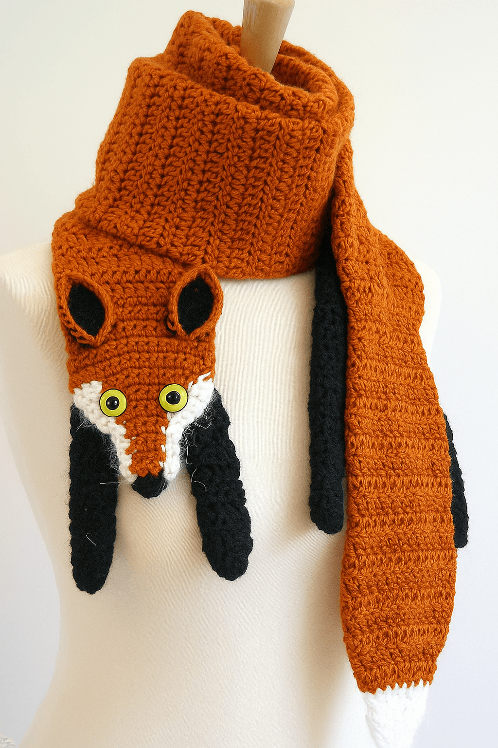 Another fun idea is to turn the scarf into a hooded fox wrap. Simply extend the pattern and add a hood with attached ears. It’s practical for cold weather and irresistibly cute, especially for kids.