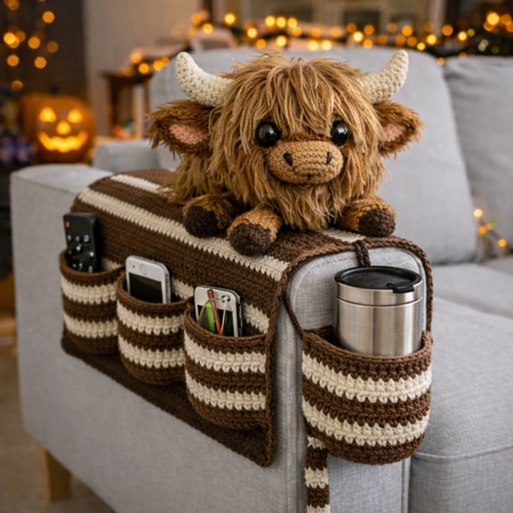 You can also customize the pocket layout. Some people prefer two large pockets, while others add multiple smaller compartments in their Crochet Highland Cow Sofa Armrest Organizer Pattern.