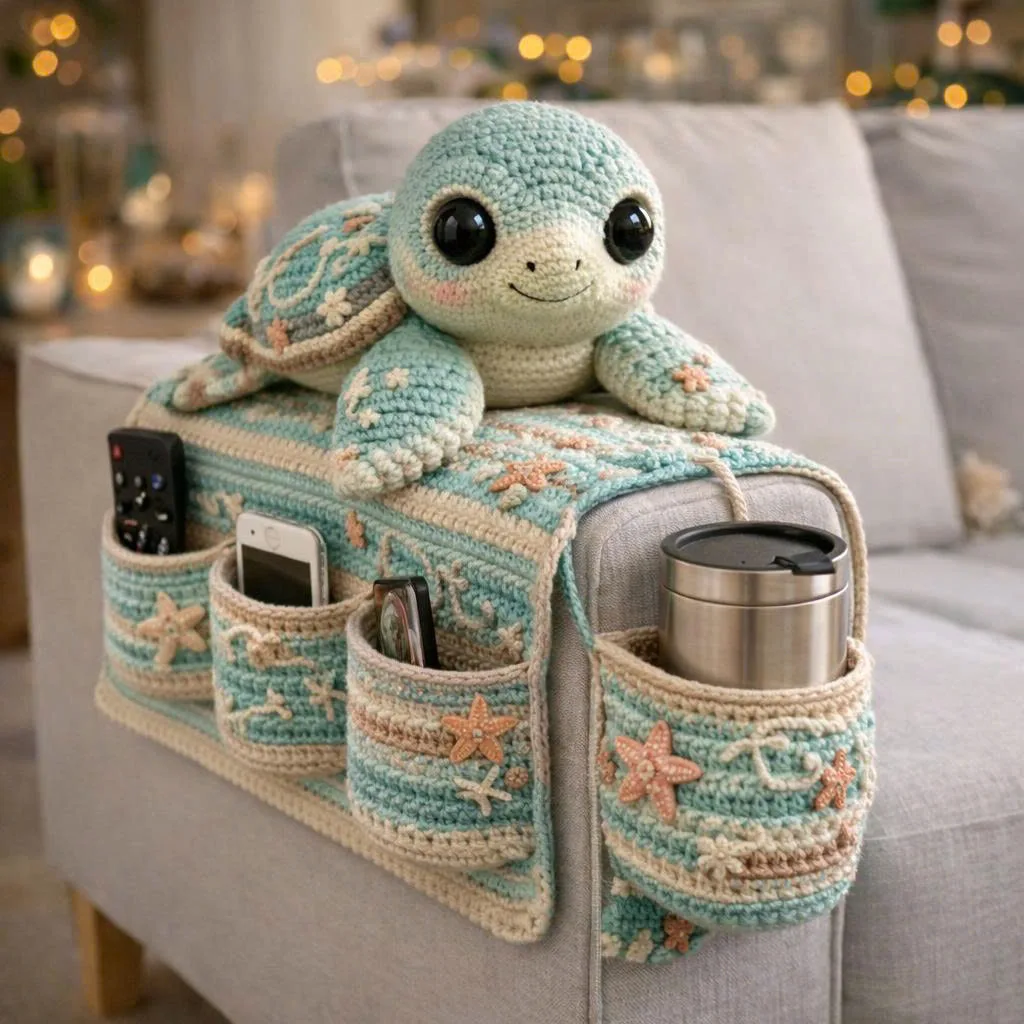 This clever accessory helps keep everyday items such as remote controls, phones, glasses, notebooks, or crochet hooks organized and within easy reach. Many people enjoy working on the Crochet Turtle Sofa Armrest Organizer Pattern because it blends decorative crochet techniques with a useful storage solution.Â