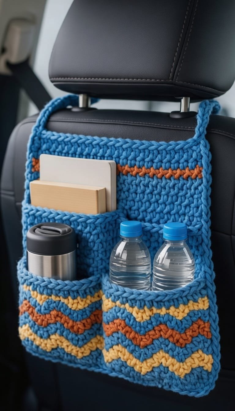 Finish your crochet car organizer by neatly weaving in all yarn ends and blocking it lightly if needed. This helps the pockets sit evenly and improves the overall shape. Once attached to the seat, it keeps essentials organized and within easy reach.