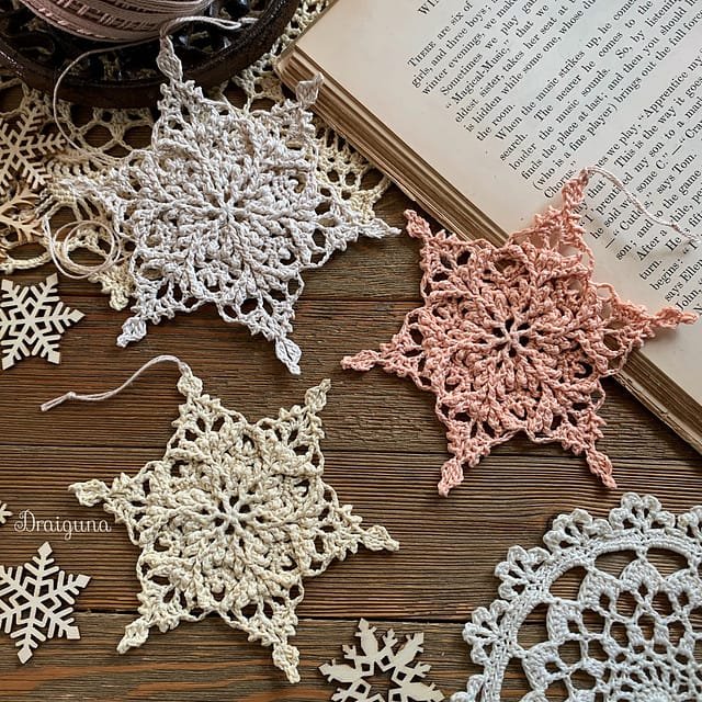 Cotton crochet thread is ideal due to its strength and crisp finish. White, silver, or pastel colors work beautifully with the delicate design of the Winterlight Snowflake.