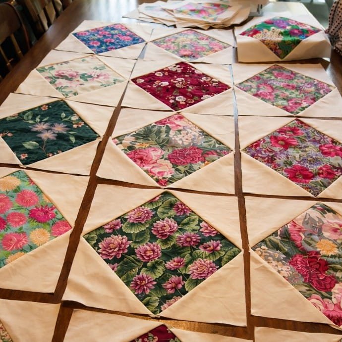 The first step in making the Patchwork Square Design Block Pattern is cutting fabric squares to the desired size.